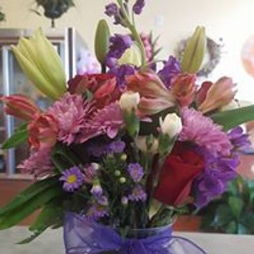 Any mixture of Roses, daisies, mums, spider mums, wax flower, lilies, astro lilies, tulips, carnations, etc in small or medium vase or basket. {Price reflects Valentine's Day price due to price increase from distributor}
